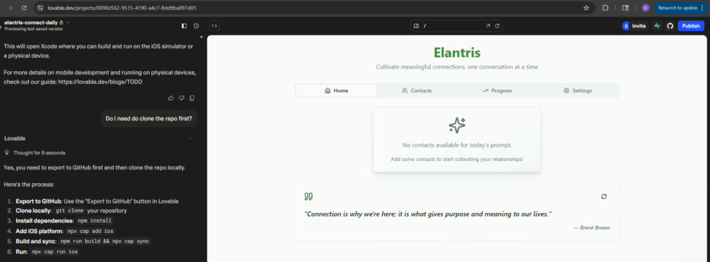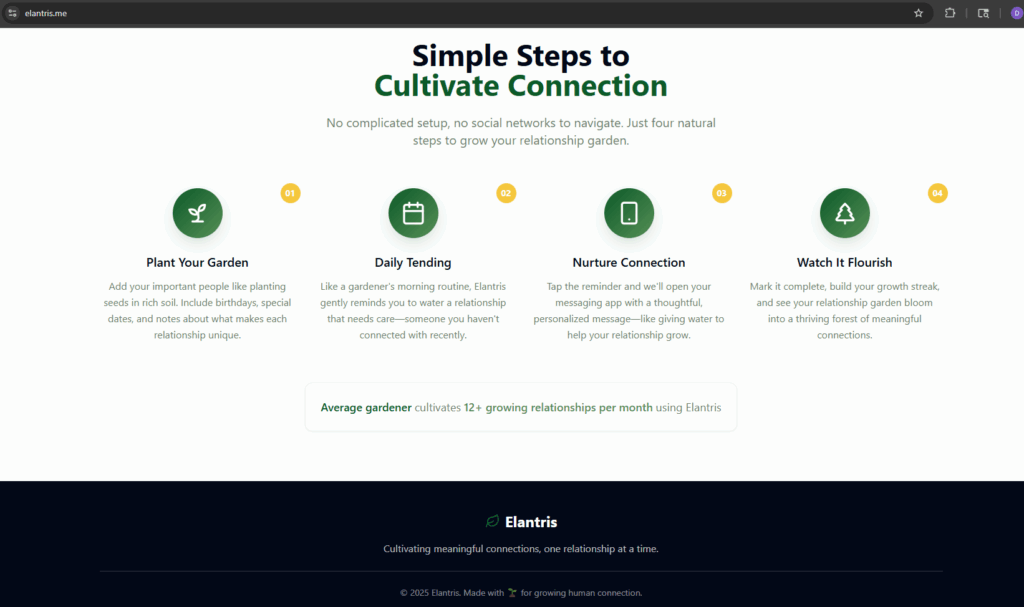 With my wife and kids out of town, I had a rare block of uninterrupted time and decided to see how far I could get with some of the new AI-powered developer tools that have been making waves. The result was Elantris – a mobile and web platform designed to help people stay connected with those who matter most through daily outreach prompts, reminders, and nudges.